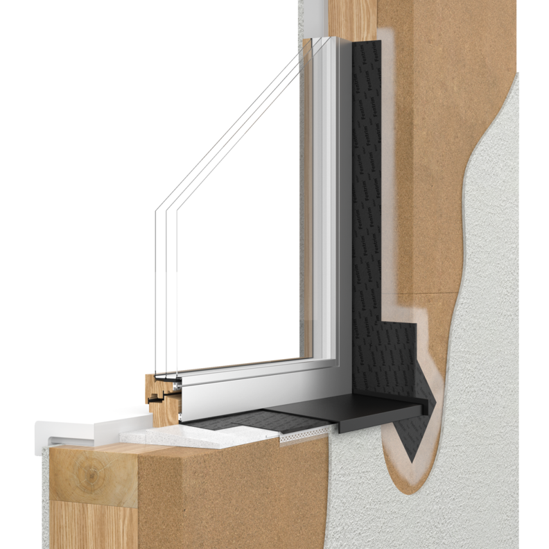 This is exactly where Fentrim IS 2 comes in. The self-adhesive membrane is applied directly beneath the windowsill in the direction of water flow and is approved for use from a slope of just 5°. Any penetrating water is effectively directed outward.